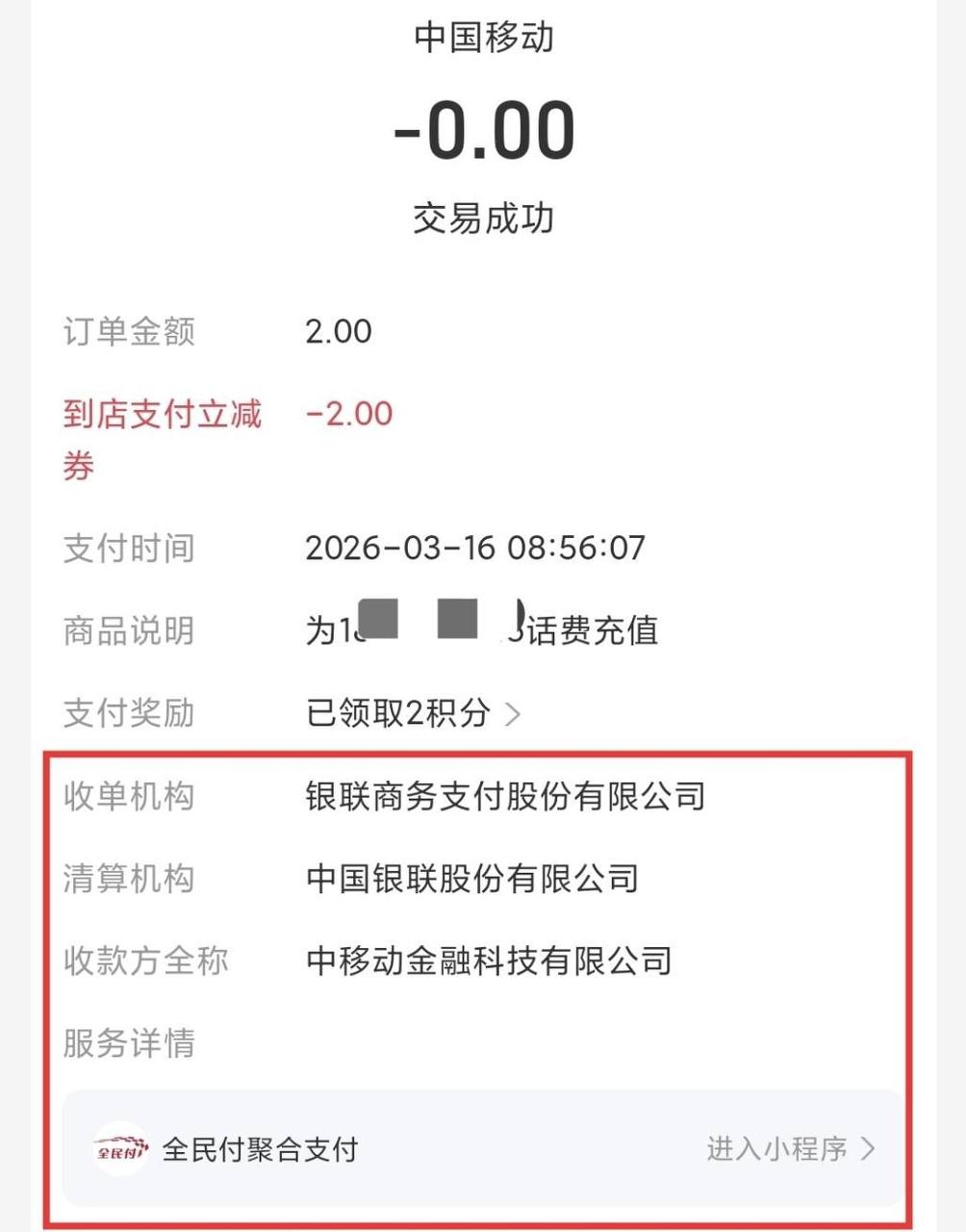 中国移动APP充话费-支付宝支付,只有先跳转到「全民付聚合支付」支付宝小程序,再进入付款页面,才可以使用“到店支付立减券”。(支付宝判定是线下支付,所以可以用券)