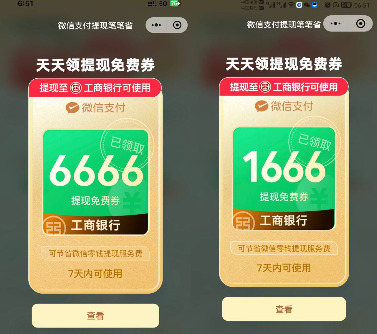 抽微信提现券 工行 6666 1666